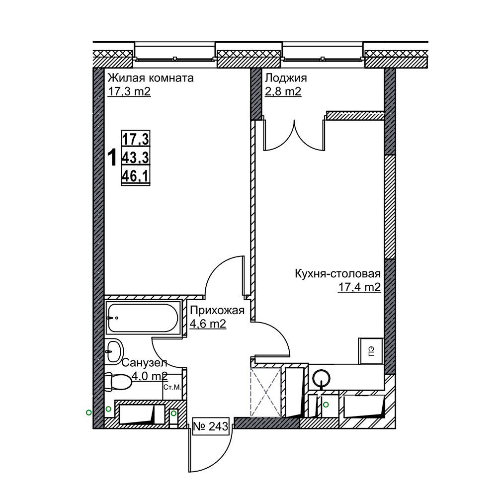 | Жилая площадь | 17.3 кв.м. |