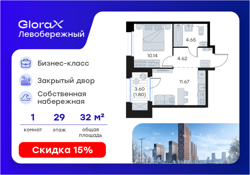 В продаже 1-комнатная квартира в новостройке жилого комплекса "GloraX Левобережный" на 29 этаже, общая площадь32,88 м.кв., кухня 11,67 м.кв. Жилой комплекс располагается по адресу Воротынская улица , д. 2. Стоимость данной квартиры составляет 9 576 469 рублей. На нашем сайте DOMEX, Вы можете оставить бесплатную on-line заявку на это предложение и с Вами свяжется напрямую застройщик.