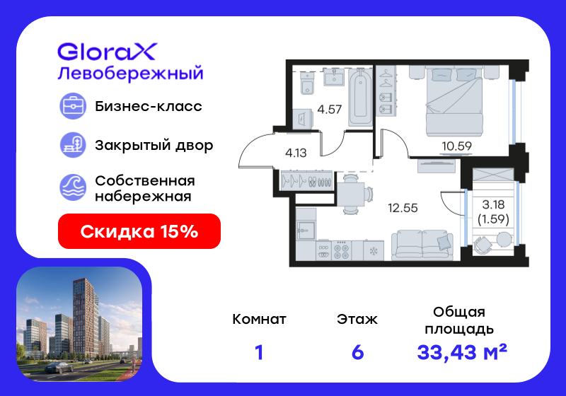 В продаже 1-комнатная квартира в новостройке жилого комплекса "GloraX Левобережный" на 6 этаже, общая площадь33,43 м.кв., кухня 12,55 м.кв. Жилой комплекс располагается по адресу Воротынская улица , д. 2. Стоимость данной квартиры составляет 8 211 763 рублей. На нашем сайте DOMEX, Вы можете оставить бесплатную on-line заявку на это предложение и с Вами свяжется напрямую застройщик.