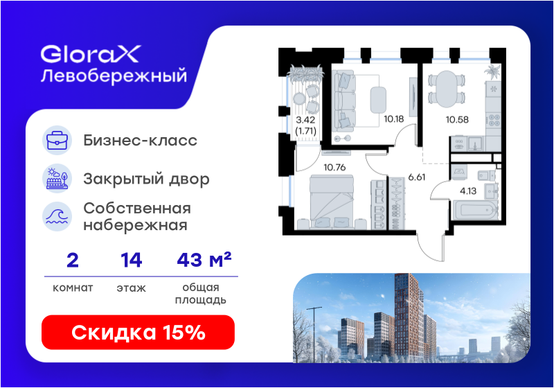 В продаже 2-комнатная квартира в новостройке жилого комплекса "GloraX Левобережный" на 14 этаже, общая площадь43,97 м.кв., кухня 10,58 м.кв. Жилой комплекс располагается по адресу Воротынская улица , д. 2. Стоимость данной квартиры составляет 10 599 998 рублей. На нашем сайте DOMEX, Вы можете оставить бесплатную on-line заявку на это предложение и с Вами свяжется напрямую застройщик.