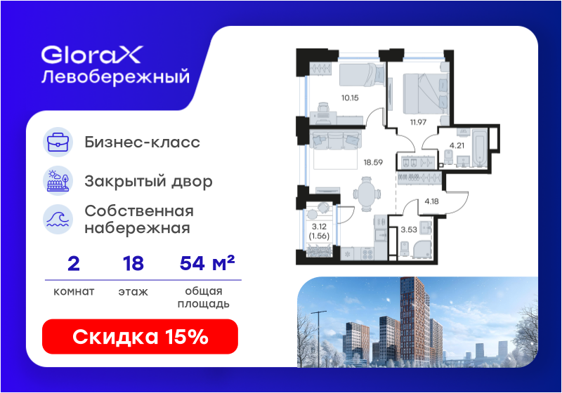 В продаже 2-комнатная квартира в новостройке жилого комплекса "GloraX Левобережный" на 18 этаже, общая площадь54,19 м.кв., кухня 18,59 м.кв. Жилой комплекс располагается по адресу Воротынская улица , д. 2. Стоимость данной квартиры составляет 12 352 940 рублей. На нашем сайте DOMEX, Вы можете оставить бесплатную on-line заявку на это предложение и с Вами свяжется напрямую застройщик.