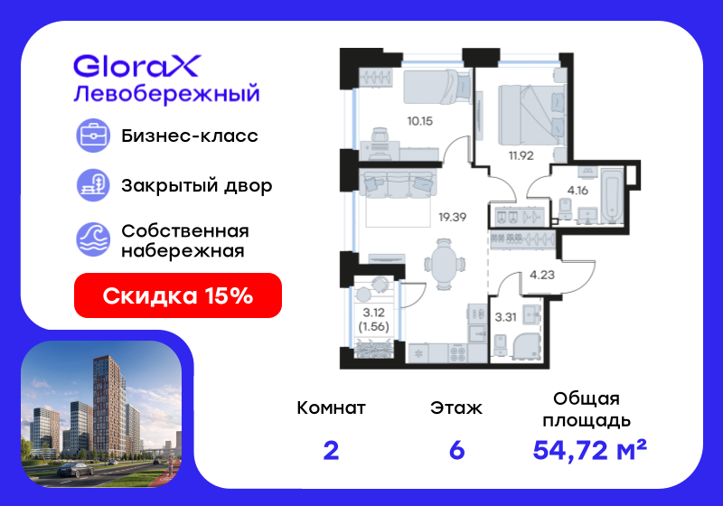 В продаже 2-комнатная квартира в новостройке жилого комплекса "GloraX Левобережный" на 6 этаже, общая площадь54,72 м.кв., кухня 19,39 м.кв. Жилой комплекс располагается по адресу Воротынская улица , д. 2. Стоимость данной квартиры составляет 11 799 998 рублей. На нашем сайте DOMEX, Вы можете оставить бесплатную on-line заявку на это предложение и с Вами свяжется напрямую застройщик.