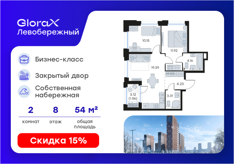 В продаже 2-комнатная квартира в новостройке жилого комплекса "GloraX Левобережный" на 8 этаже, общая площадь54,72 м.кв., кухня 19,39 м.кв. Жилой комплекс располагается по адресу Воротынская улица , д. 2. Стоимость данной квартиры составляет 12 058 822 рублей. На нашем сайте DOMEX, Вы можете оставить бесплатную on-line заявку на это предложение и с Вами свяжется напрямую застройщик.