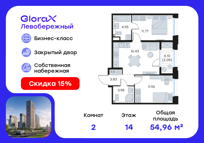 В продаже 2-комнатная квартира в новостройке жилого комплекса "GloraX Левобережный" на 14 этаже, общая площадь54,96 м.кв., кухня 16,43 м.кв. Жилой комплекс располагается по адресу Воротынская улица , д. 2. Стоимость данной квартиры составляет 11 247 057 рублей. На нашем сайте DOMEX, Вы можете оставить бесплатную on-line заявку на это предложение и с Вами свяжется напрямую застройщик.
