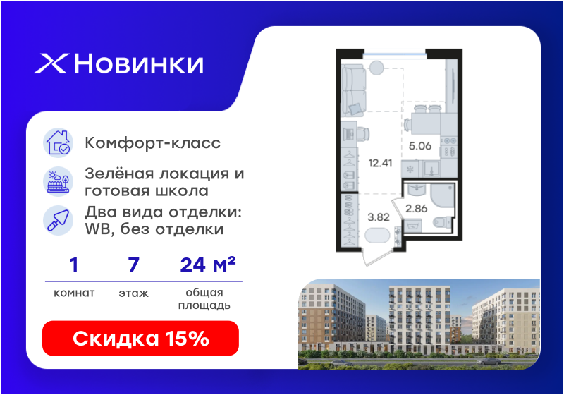 В продаже квартира в новостройке жилого комплекса "Новинки" на 7 этаже, общая площадь24,15 м.кв. Жилой комплекс располагается по адресу Богородский микрорайон . Стоимость данной квартиры составляет 5 529 410 рублей. На нашем сайте DOMEX, Вы можете оставить бесплатную on-line заявку на это предложение и с Вами свяжется напрямую застройщик.