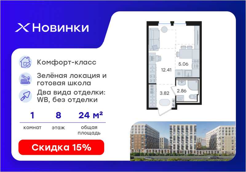 В продаже квартира в новостройке жилого комплекса "Новинки" на 8 этаже, общая площадь24,15 м.кв. Жилой комплекс располагается по адресу Богородский микрорайон . Стоимость данной квартиры составляет 5 552 940 рублей. На нашем сайте DOMEX, Вы можете оставить бесплатную on-line заявку на это предложение и с Вами свяжется напрямую застройщик.