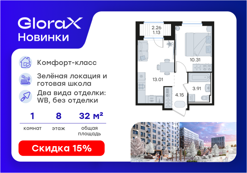 В продаже 1-комнатная квартира в новостройке жилого комплекса "GloraX Новинки (Глоракс)" на 8 этаже, общая площадь32,51 м.кв., кухня 13,01 м.кв. Жилой комплекс располагается по адресу Богородский микрорайон . Стоимость данной квартиры составляет 6 423 528 рублей. На нашем сайте DOMEX, Вы можете оставить бесплатную on-line заявку на это предложение и с Вами свяжется напрямую застройщик.