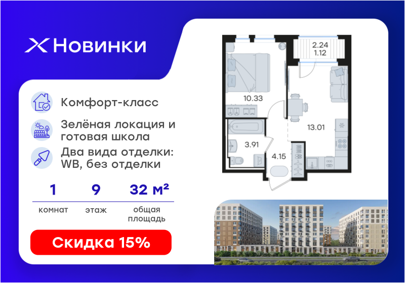 В продаже 1-комнатная квартира в новостройке жилого комплекса "Новинки" на 9 этаже, общая площадь32,52 м.кв., кухня 13,01 м.кв. Жилой комплекс располагается по адресу Богородский микрорайон . Стоимость данной квартиры составляет 5 999 998 рублей. На нашем сайте DOMEX, Вы можете оставить бесплатную on-line заявку на это предложение и с Вами свяжется напрямую застройщик.