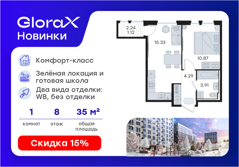 В продаже 1-комнатная квартира в новостройке жилого комплекса "GloraX Новинки (Глоракс)" на 8 этаже, общая площадь35,52 м.кв., кухня 15,33 м.кв. Жилой комплекс располагается по адресу Богородский микрорайон . Стоимость данной квартиры составляет 6 341 175 рублей. На нашем сайте DOMEX, Вы можете оставить бесплатную on-line заявку на это предложение и с Вами свяжется напрямую застройщик.