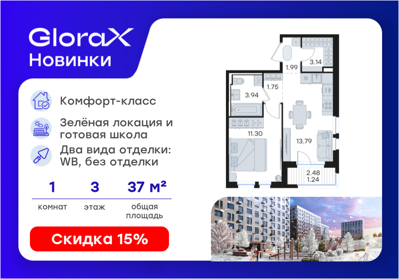 В продаже 1-комнатная квартира в новостройке жилого комплекса "GloraX Новинки (Глоракс)" на 3 этаже, общая площадь37,15 м.кв., кухня 13,79 м.кв. Жилой комплекс располагается по адресу Богородский микрорайон . Стоимость данной квартиры составляет 7 799 998 рублей. На нашем сайте DOMEX, Вы можете оставить бесплатную on-line заявку на это предложение и с Вами свяжется напрямую застройщик.