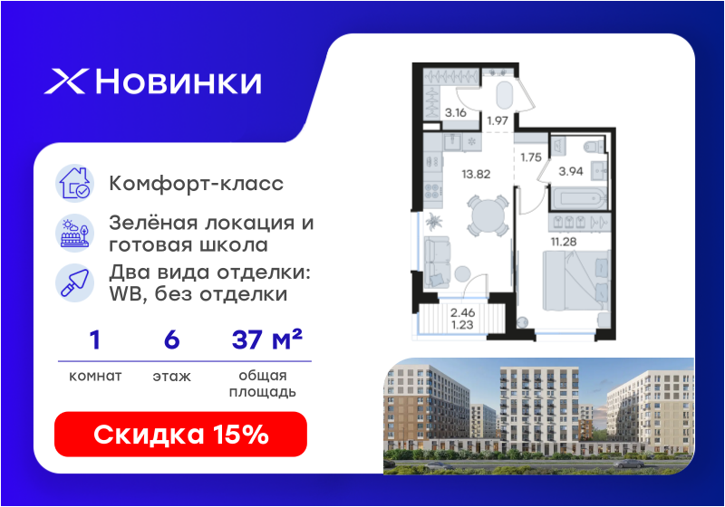 В продаже 1-комнатная квартира в новостройке жилого комплекса "Новинки" на 6 этаже, общая площадь37,15 м.кв., кухня 13,82 м.кв. Жилой комплекс располагается по адресу Богородский микрорайон . Стоимость данной квартиры составляет 8 058 822 рублей. На нашем сайте DOMEX, Вы можете оставить бесплатную on-line заявку на это предложение и с Вами свяжется напрямую застройщик.