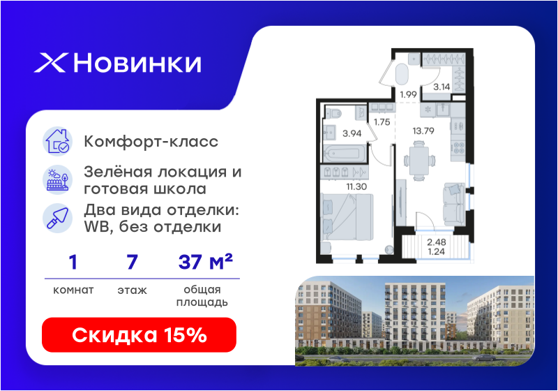 В продаже 1-комнатная квартира в новостройке жилого комплекса "Новинки" на 7 этаже, общая площадь37,15 м.кв., кухня 13,79 м.кв. Жилой комплекс располагается по адресу Богородский микрорайон . Стоимость данной квартиры составляет 8 011 763 рублей. На нашем сайте DOMEX, Вы можете оставить бесплатную on-line заявку на это предложение и с Вами свяжется напрямую застройщик.