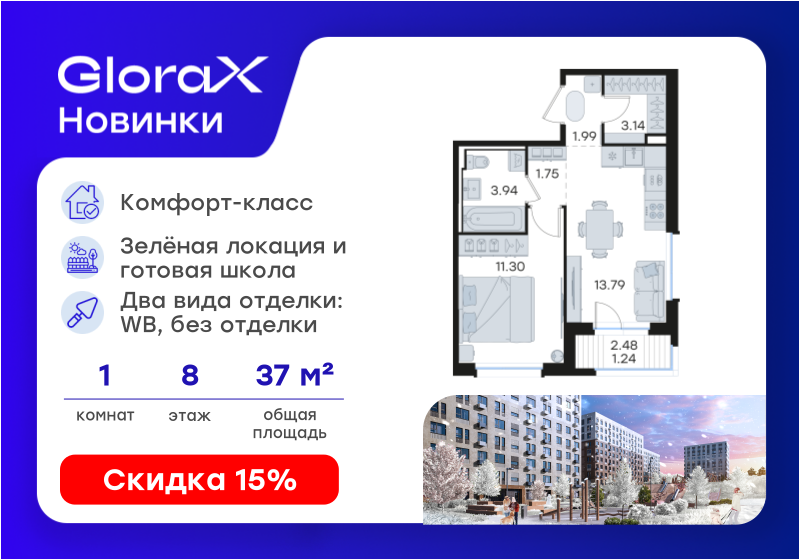 В продаже 1-комнатная квартира в новостройке жилого комплекса "GloraX Новинки (Глоракс)" на 8 этаже, общая площадь37,15 м.кв., кухня 13,79 м.кв. Жилой комплекс располагается по адресу Богородский микрорайон . Стоимость данной квартиры составляет 7 952 940 рублей. На нашем сайте DOMEX, Вы можете оставить бесплатную on-line заявку на это предложение и с Вами свяжется напрямую застройщик.