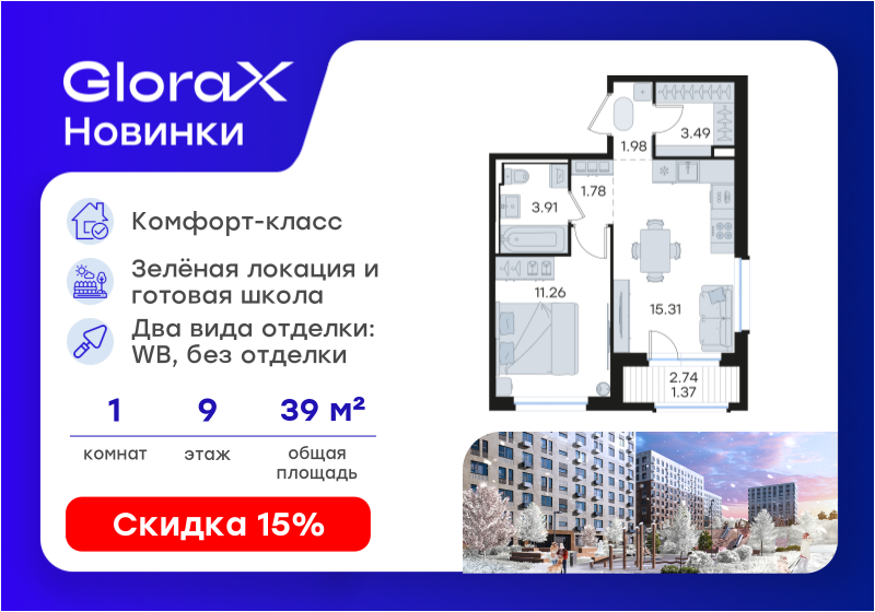 В продаже 1-комнатная квартира в новостройке жилого комплекса "GloraX Новинки (Глоракс)" на 9 этаже, общая площадь39,10 м.кв., кухня 15,31 м.кв. Жилой комплекс располагается по адресу Богородский микрорайон . Стоимость данной квартиры составляет 7 188 234 рублей. На нашем сайте DOMEX, Вы можете оставить бесплатную on-line заявку на это предложение и с Вами свяжется напрямую застройщик.