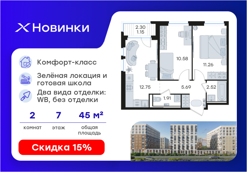 В продаже 2-комнатная квартира в новостройке жилого комплекса "Новинки" на 7 этаже, общая площадь45,86 м.кв., кухня 12,75 м.кв. Жилой комплекс располагается по адресу Богородский микрорайон . Стоимость данной квартиры составляет 8 149 999 рублей. На нашем сайте DOMEX, Вы можете оставить бесплатную on-line заявку на это предложение и с Вами свяжется напрямую застройщик.