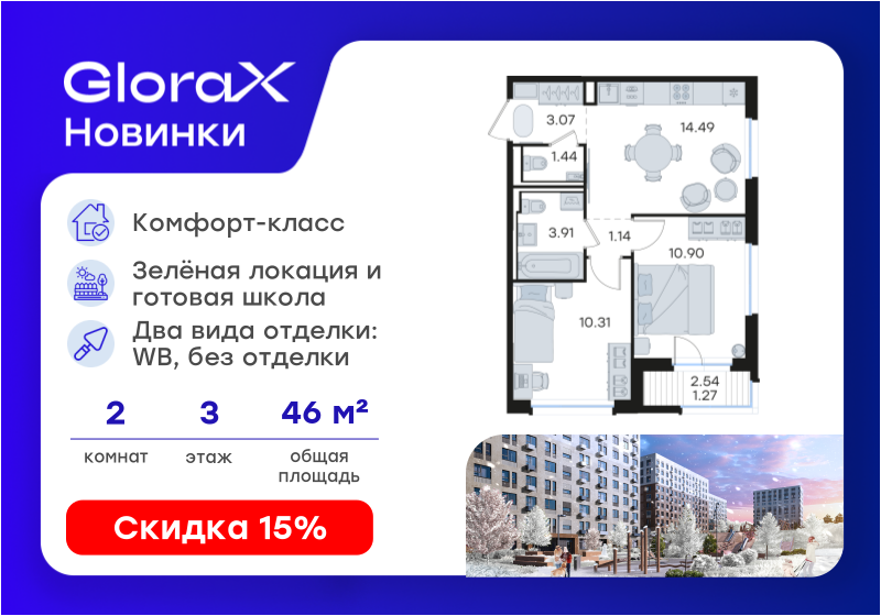 В продаже 2-комнатная квартира в новостройке жилого комплекса "GloraX Новинки (Глоракс)" на 3 этаже, общая площадь46,53 м.кв., кухня 14,49 м.кв. Жилой комплекс располагается по адресу Богородский микрорайон . Стоимость данной квартиры составляет 8 529 410 рублей. На нашем сайте DOMEX, Вы можете оставить бесплатную on-line заявку на это предложение и с Вами свяжется напрямую застройщик.