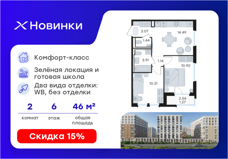 В продаже 2-комнатная квартира в новостройке жилого комплекса "Новинки" на 6 этаже, общая площадь46,53 м.кв., кухня 14,49 м.кв. Жилой комплекс располагается по адресу Богородский микрорайон . Стоимость данной квартиры составляет 8 847 057 рублей. На нашем сайте DOMEX, Вы можете оставить бесплатную on-line заявку на это предложение и с Вами свяжется напрямую застройщик.
