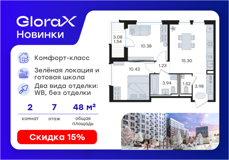 В продаже 2-комнатная квартира в новостройке жилого комплекса "GloraX Новинки (Глоракс)" на 7 этаже, общая площадь48,32 м.кв., кухня 15,30 м.кв. Жилой комплекс располагается по адресу Богородский микрорайон . Стоимость данной квартиры составляет 9 105 881 рублей. На нашем сайте DOMEX, Вы можете оставить бесплатную on-line заявку на это предложение и с Вами свяжется напрямую застройщик.
