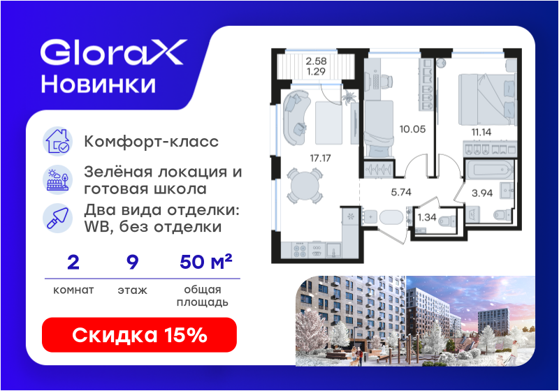 В продаже 2-комнатная квартира в новостройке жилого комплекса "GloraX Новинки (Глоракс)" на 9 этаже, общая площадь50,67 м.кв., кухня 17,17 м.кв. Жилой комплекс располагается по адресу Богородский микрорайон . Стоимость данной квартиры составляет 9 835 292 рублей. На нашем сайте DOMEX, Вы можете оставить бесплатную on-line заявку на это предложение и с Вами свяжется напрямую застройщик.