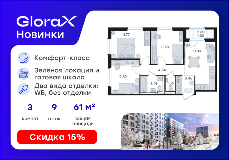 В продаже 3-комнатная квартира в новостройке жилого комплекса "GloraX Новинки (Глоракс)" на 9 этаже, общая площадь61,52 м.кв., кухня 13,89 м.кв. Жилой комплекс располагается по адресу Богородский микрорайон . Стоимость данной квартиры составляет 10 894 116 рублей. На нашем сайте DOMEX, Вы можете оставить бесплатную on-line заявку на это предложение и с Вами свяжется напрямую застройщик.
