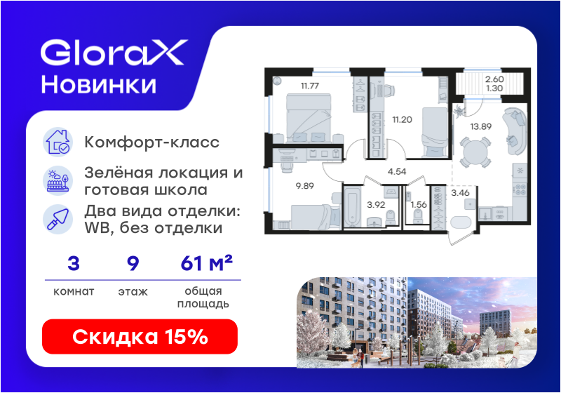 В продаже 3-комнатная квартира в новостройке жилого комплекса "GloraX Новинки (Глоракс)" на 9 этаже, общая площадь61,53 м.кв., кухня 13,89 м.кв. Жилой комплекс располагается по адресу Богородский микрорайон . Стоимость данной квартиры составляет 11 235 292 рублей. На нашем сайте DOMEX, Вы можете оставить бесплатную on-line заявку на это предложение и с Вами свяжется напрямую застройщик.