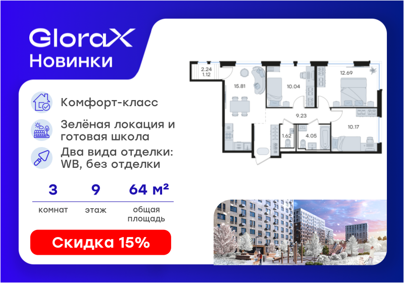 В продаже 3-комнатная квартира в новостройке жилого комплекса "GloraX Новинки (Глоракс)" на 9 этаже, общая площадь64,73 м.кв., кухня 15,81 м.кв. Жилой комплекс располагается по адресу Богородский микрорайон . Стоимость данной квартиры составляет 11 976 469 рублей. На нашем сайте DOMEX, Вы можете оставить бесплатную on-line заявку на это предложение и с Вами свяжется напрямую застройщик.