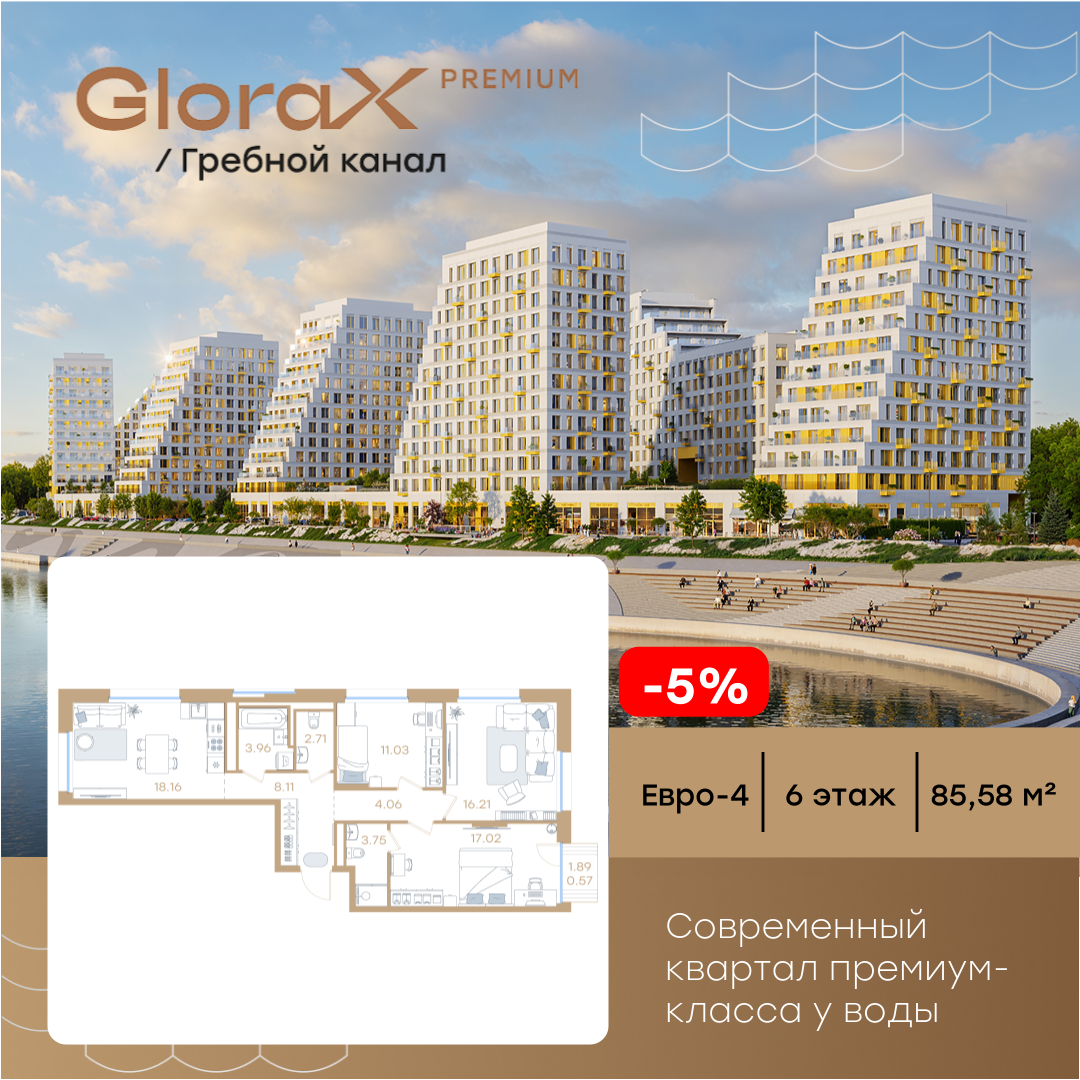 В продаже 3-комнатная квартира в новостройке жилого комплекса "GloraX Premium Гребной канал" на 6 этаже, общая площадь85,58 м.кв., кухня 18,16 м.кв. Жилой комплекс располагается по адресу Набережная Гребного канала улица . Стоимость данной квартиры составляет 24 284 209 рублей. На нашем сайте DOMEX, Вы можете оставить бесплатную on-line заявку на это предложение и с Вами свяжется напрямую застройщик.