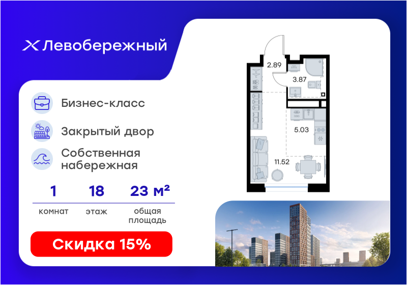 В продаже квартира в новостройке жилого комплекса "Левобережный" на 18 этаже, общая площадь23,31 м.кв. Жилой комплекс располагается по адресу Воротынская улица , д. 2. Стоимость данной квартиры составляет 6 589 999 рублей. На нашем сайте DOMEX, Вы можете оставить бесплатную on-line заявку на это предложение и с Вами свяжется напрямую застройщик.