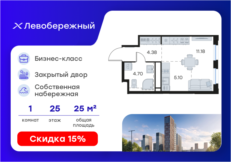 В продаже квартира в новостройке жилого комплекса "Левобережный" на 25 этаже, общая площадь25,36 м.кв. Жилой комплекс располагается по адресу Воротынская улица , д. 2. Стоимость данной квартиры составляет 6 699 999 рублей. На нашем сайте DOMEX, Вы можете оставить бесплатную on-line заявку на это предложение и с Вами свяжется напрямую застройщик.