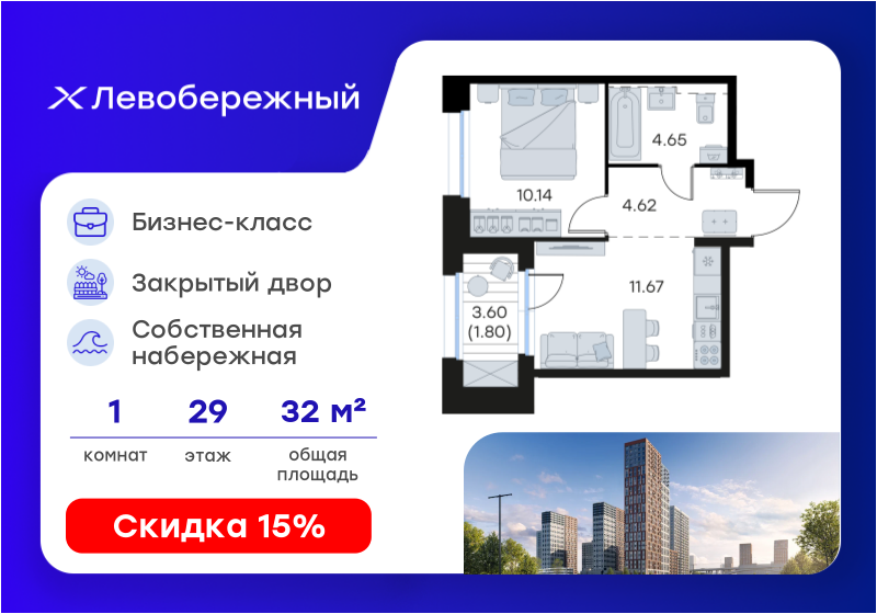 В продаже 1-комнатная квартира в новостройке жилого комплекса "Левобережный" на 29 этаже, общая площадь32,88 м.кв., кухня 11,67 м.кв. Жилой комплекс располагается по адресу Воротынская улица , д. 2. Стоимость данной квартиры составляет 8 139 999 рублей. На нашем сайте DOMEX, Вы можете оставить бесплатную on-line заявку на это предложение и с Вами свяжется напрямую застройщик.