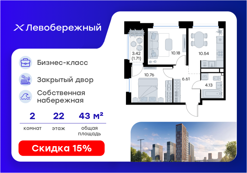 В продаже 2-комнатная квартира в новостройке жилого комплекса "Левобережный" на 22 этаже, общая площадь43,93 м.кв., кухня 10,54 м.кв. Жилой комплекс располагается по адресу Воротынская улица , д. 2. Стоимость данной квартиры составляет 9 769 999 рублей. На нашем сайте DOMEX, Вы можете оставить бесплатную on-line заявку на это предложение и с Вами свяжется напрямую застройщик.