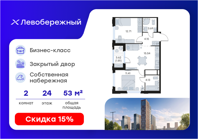 В продаже 2-комнатная квартира в новостройке жилого комплекса "Левобережный" на 24 этаже, общая площадь53,44 м.кв., кухня 15,54 м.кв. Жилой комплекс располагается по адресу Воротынская улица , д. 2. Стоимость данной квартиры составляет 10 799 999 рублей. На нашем сайте DOMEX, Вы можете оставить бесплатную on-line заявку на это предложение и с Вами свяжется напрямую застройщик.