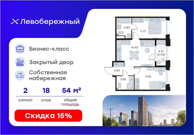 В продаже 2-комнатная квартира в новостройке жилого комплекса "Левобережный" на 18 этаже, общая площадь54,81 м.кв., кухня 16,43 м.кв. Жилой комплекс располагается по адресу Воротынская улица , д. 2. Стоимость данной квартиры составляет 10 679 999 рублей. На нашем сайте DOMEX, Вы можете оставить бесплатную on-line заявку на это предложение и с Вами свяжется напрямую застройщик.