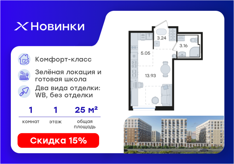 В продаже квартира в новостройке жилого комплекса "Новинки" на 1 этаже, общая площадь25,38 м.кв. Жилой комплекс располагается по адресу Богородский микрорайон . Стоимость данной квартиры составляет 4 699 999 рублей. На нашем сайте DOMEX, Вы можете оставить бесплатную on-line заявку на это предложение и с Вами свяжется напрямую застройщик.