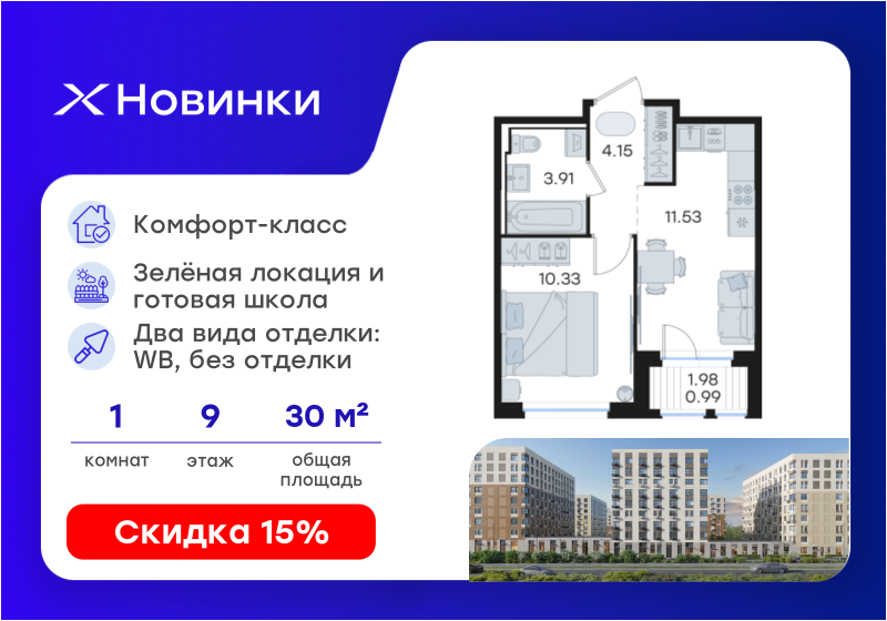 В продаже 1-комнатная квартира в новостройке жилого комплекса "Новинки" на 9 этаже, общая площадь30,91 м.кв., кухня 11,53 м.кв. Жилой комплекс располагается по адресу Богородский микрорайон . Стоимость данной квартиры составляет 6 019 999 рублей. На нашем сайте DOMEX, Вы можете оставить бесплатную on-line заявку на это предложение и с Вами свяжется напрямую застройщик.