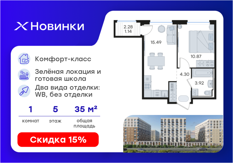 В продаже 1-комнатная квартира в новостройке жилого комплекса "Новинки" на 5 этаже, общая площадь35,72 м.кв., кухня 15,49 м.кв. Жилой комплекс располагается по адресу Богородский микрорайон . Стоимость данной квартиры составляет 7 764 704 рублей. На нашем сайте DOMEX, Вы можете оставить бесплатную on-line заявку на это предложение и с Вами свяжется напрямую застройщик.