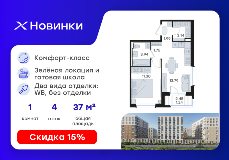 В продаже 1-комнатная квартира в новостройке жилого комплекса "Новинки" на 4 этаже, общая площадь37,15 м.кв., кухня 13,79 м.кв. Жилой комплекс располагается по адресу Богородский микрорайон . Стоимость данной квартиры составляет 7 929 410 рублей. На нашем сайте DOMEX, Вы можете оставить бесплатную on-line заявку на это предложение и с Вами свяжется напрямую застройщик.