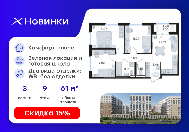 В продаже 3-комнатная квартира в новостройке жилого комплекса "Новинки" на 9 этаже, общая площадь61,52 м.кв., кухня 13,89 м.кв. Жилой комплекс располагается по адресу Богородский микрорайон . Стоимость данной квартиры составляет 9 359 999 рублей. На нашем сайте DOMEX, Вы можете оставить бесплатную on-line заявку на это предложение и с Вами свяжется напрямую застройщик.