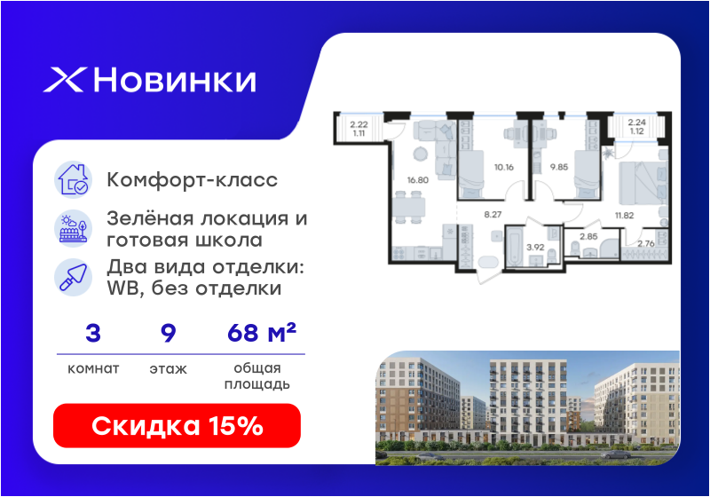 В продаже 3-комнатная квартира в новостройке жилого комплекса "Новинки" на 9 этаже, общая площадь68,66 м.кв., кухня 16,80 м.кв. Жилой комплекс располагается по адресу Богородский микрорайон . Стоимость данной квартиры составляет 12 519 999 рублей. На нашем сайте DOMEX, Вы можете оставить бесплатную on-line заявку на это предложение и с Вами свяжется напрямую застройщик.