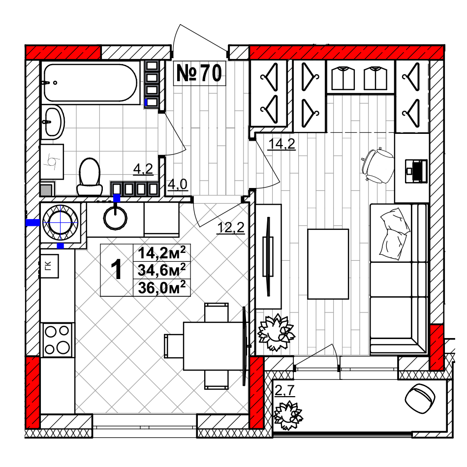 | Жилая площадь | 14.2 кв.м. |