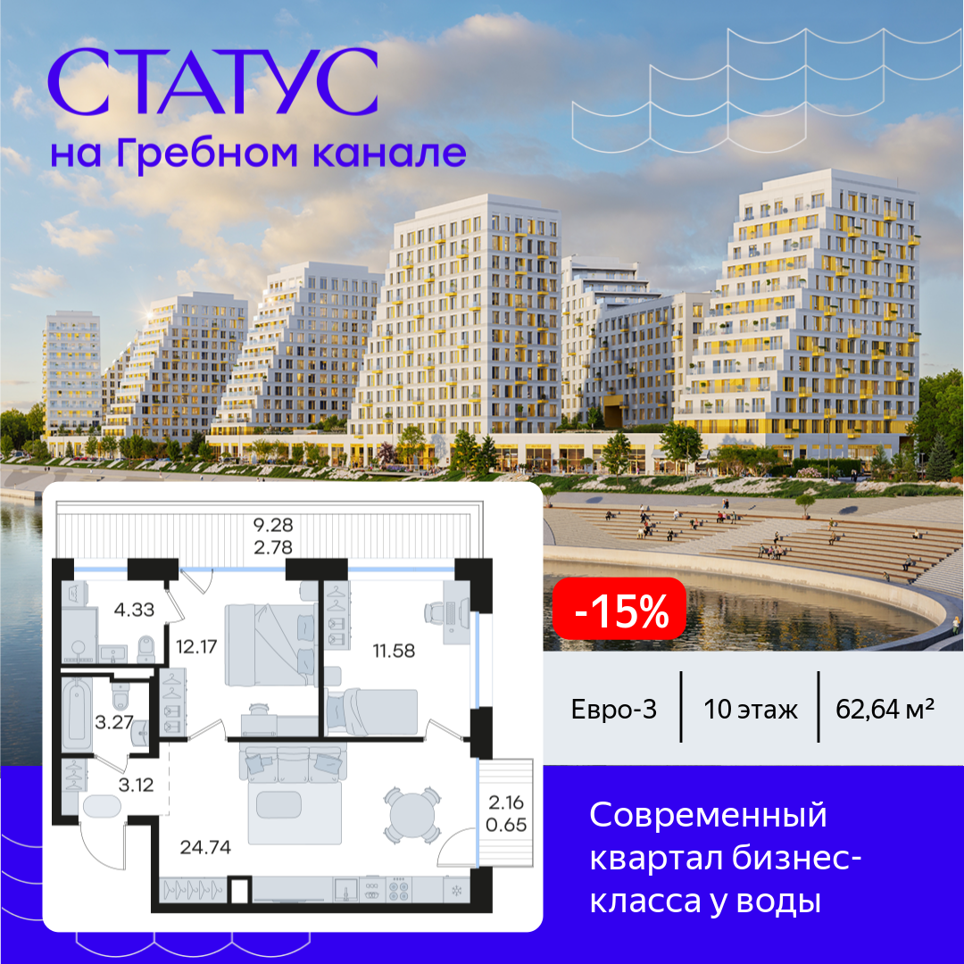 В продаже 2-комнатная квартира в новостройке жилого комплекса "СТАТУС на Гребном канале" на 10 этаже, общая площадь62,64 м.кв., кухня 24,74 м.кв. Жилой комплекс располагается по адресу Набережная Гребного канала улица . Стоимость данной квартиры составляет 21 249 999 рублей. На нашем сайте DOMEX, Вы можете оставить бесплатную on-line заявку на это предложение и с Вами свяжется напрямую застройщик.