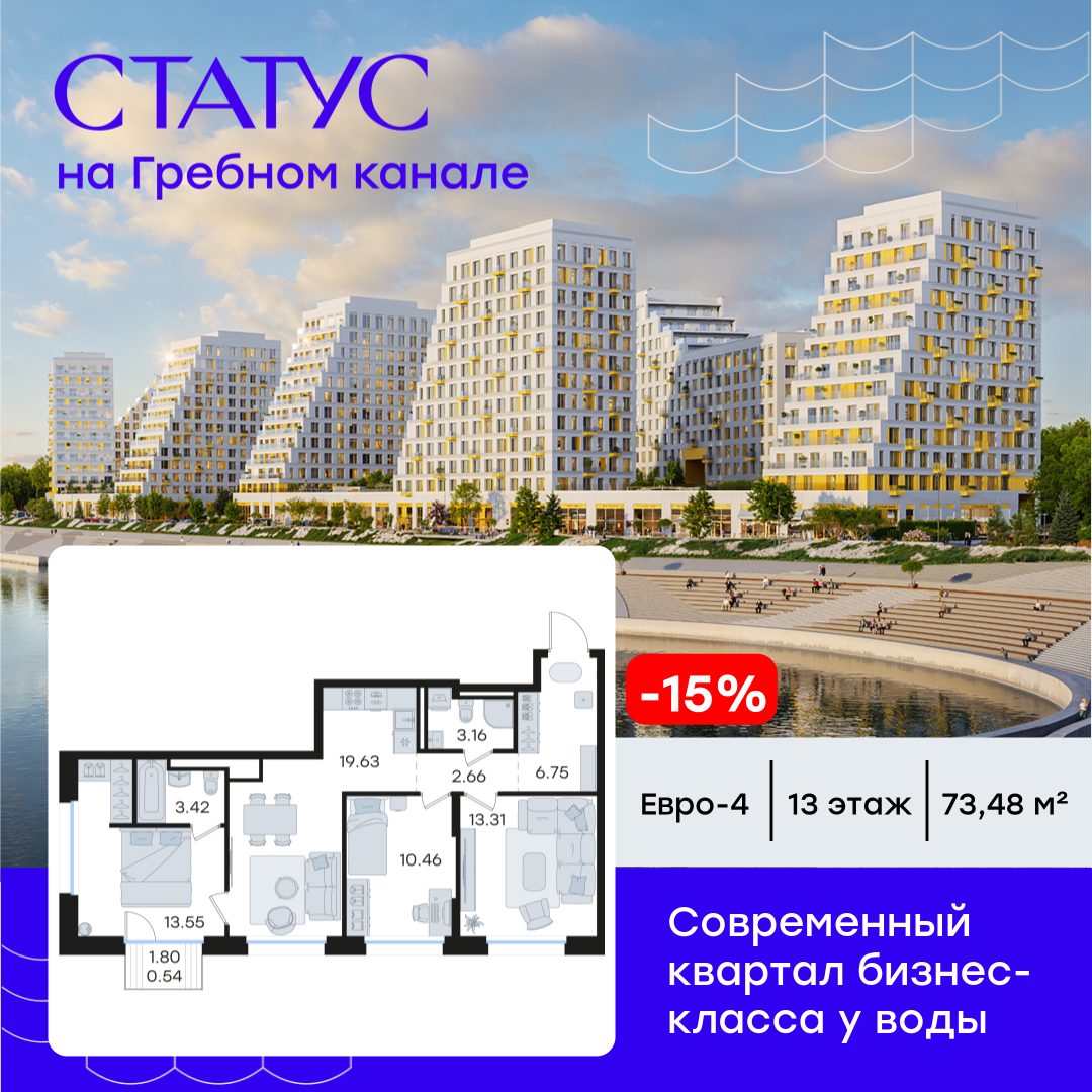 В продаже 3-комнатная квартира в новостройке жилого комплекса "СТАТУС на Гребном канале" на 13 этаже, общая площадь73,48 м.кв., кухня 19,63 м.кв. Жилой комплекс располагается по адресу Набережная Гребного канала улица . Стоимость данной квартиры составляет 17 749 999 рублей. На нашем сайте DOMEX, Вы можете оставить бесплатную on-line заявку на это предложение и с Вами свяжется напрямую застройщик.