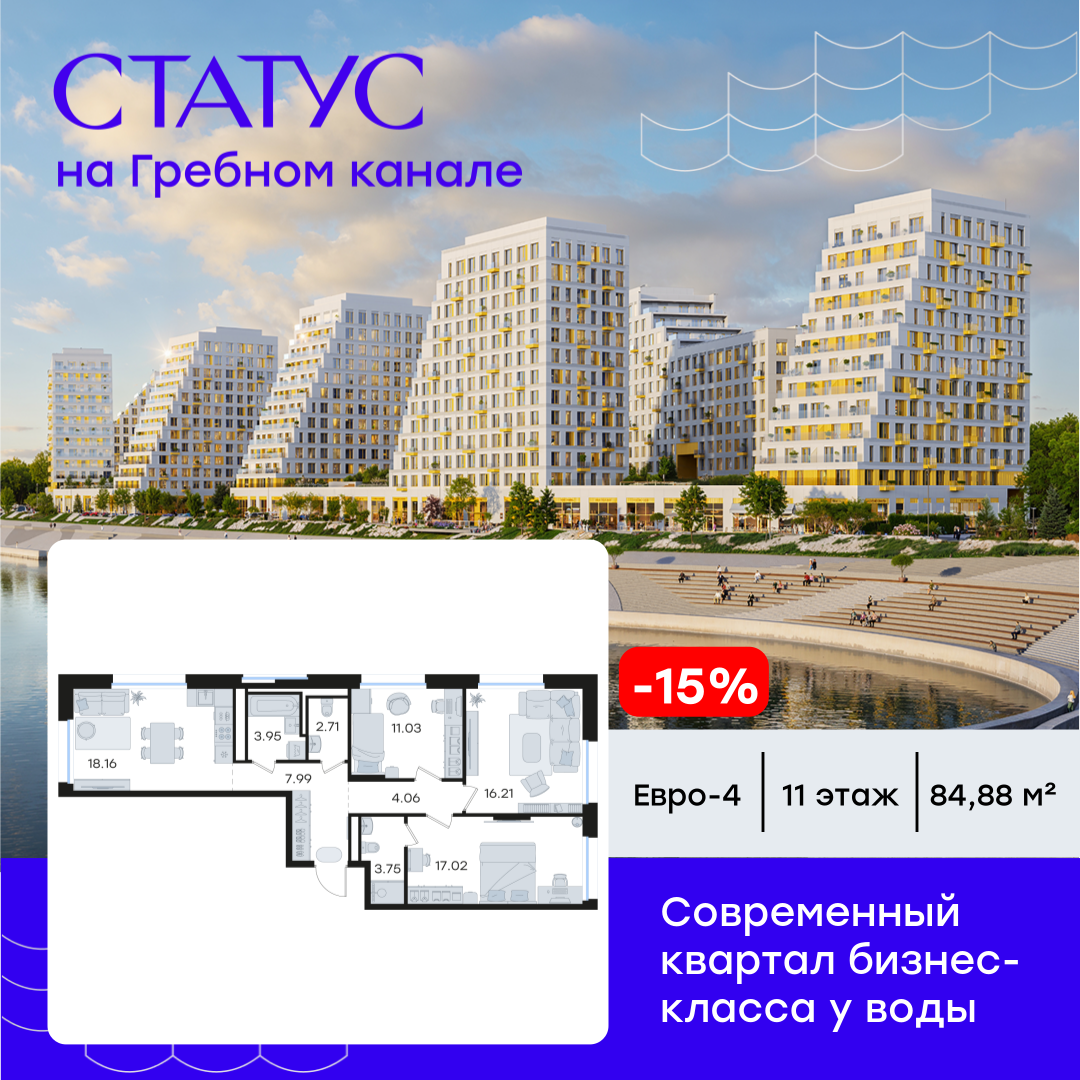 В продаже 3-комнатная квартира в новостройке жилого комплекса "СТАТУС на Гребном канале" на 11 этаже, общая площадь84,88 м.кв., кухня 18,16 м.кв. Жилой комплекс располагается по адресу Набережная Гребного канала улица . Стоимость данной квартиры составляет 19 659 999 рублей. На нашем сайте DOMEX, Вы можете оставить бесплатную on-line заявку на это предложение и с Вами свяжется напрямую застройщик.