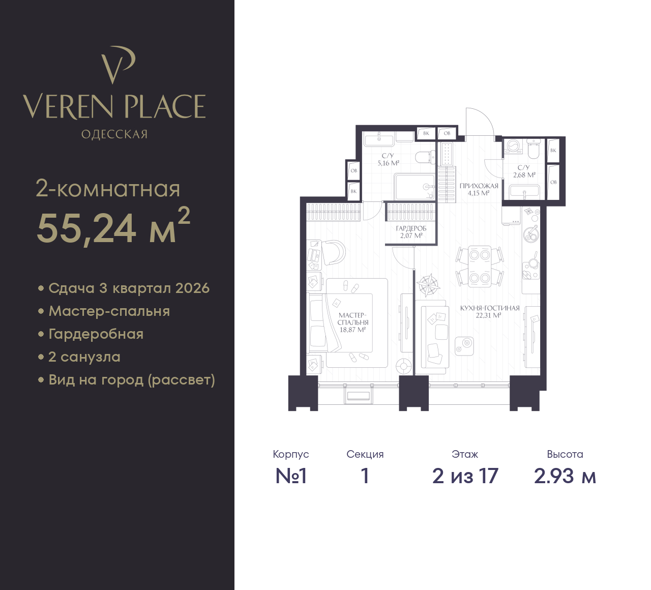Квартира в ЖК «VEREN PLACE ОДЕССКАЯ (Верен Плейс)» 55.24м2 на 2 этаже